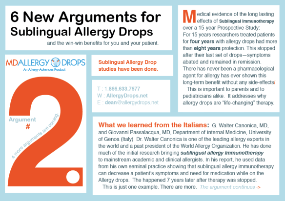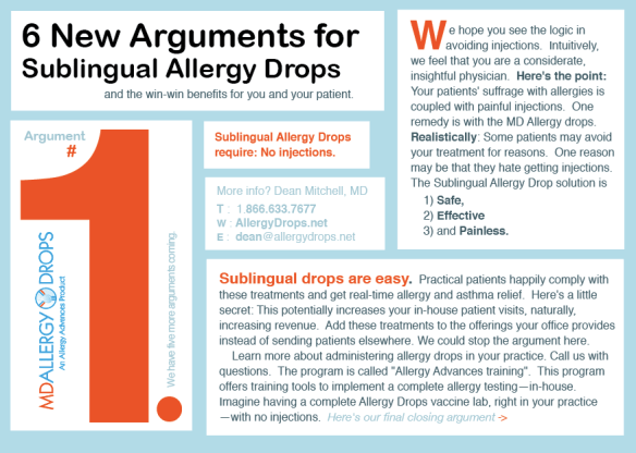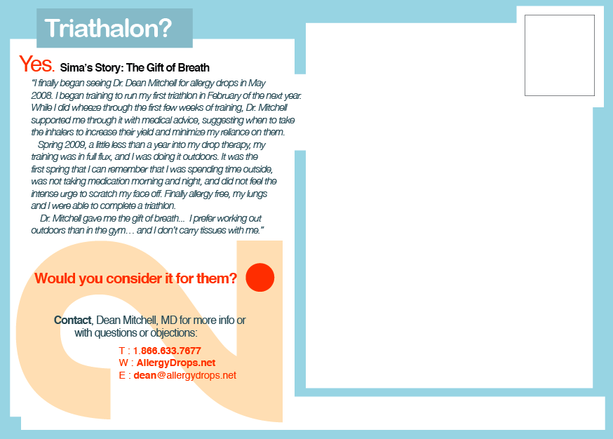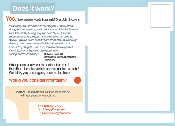Below is another type of ad. It’s a Business to Business (B2B) ‘copy driven, direct mail piece’. This particular campaign is a series of six postcards. Each are boldly numbered 1-6 and the idea was based on psychological research into the mindset and MBTI personality types of ‘doctors who are allergists’.