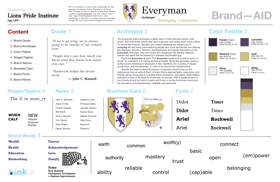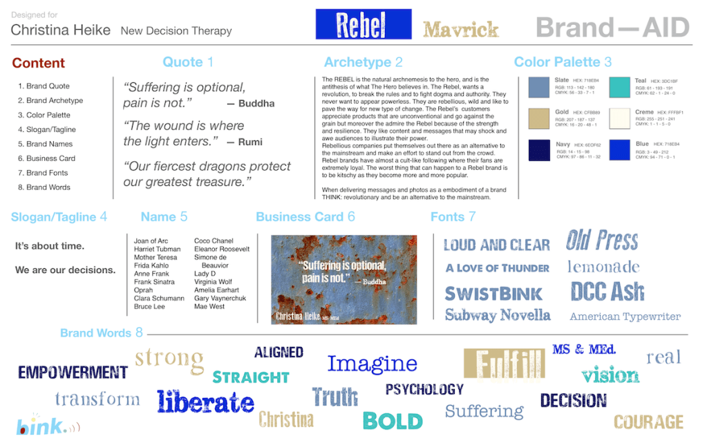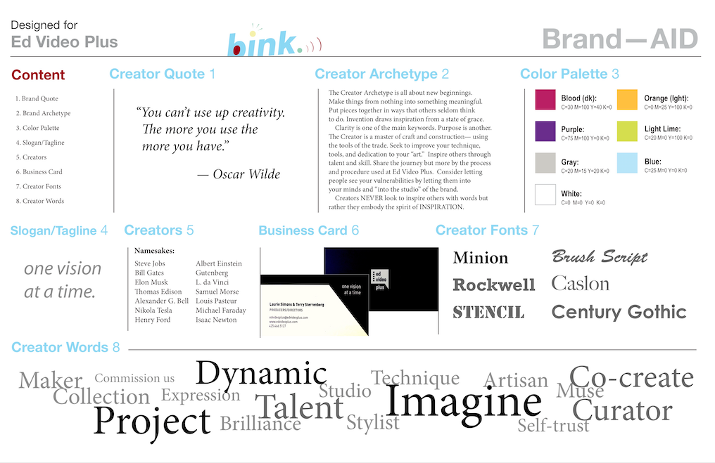 A Brand—AID is fraction of the cost ($3.K) of a full blown Brand—ID ($15K). It is a one-page guide (11″ x17″) to get more new clients/customers moving toward your company for more sales. A brand is the glue that sticks in their head.